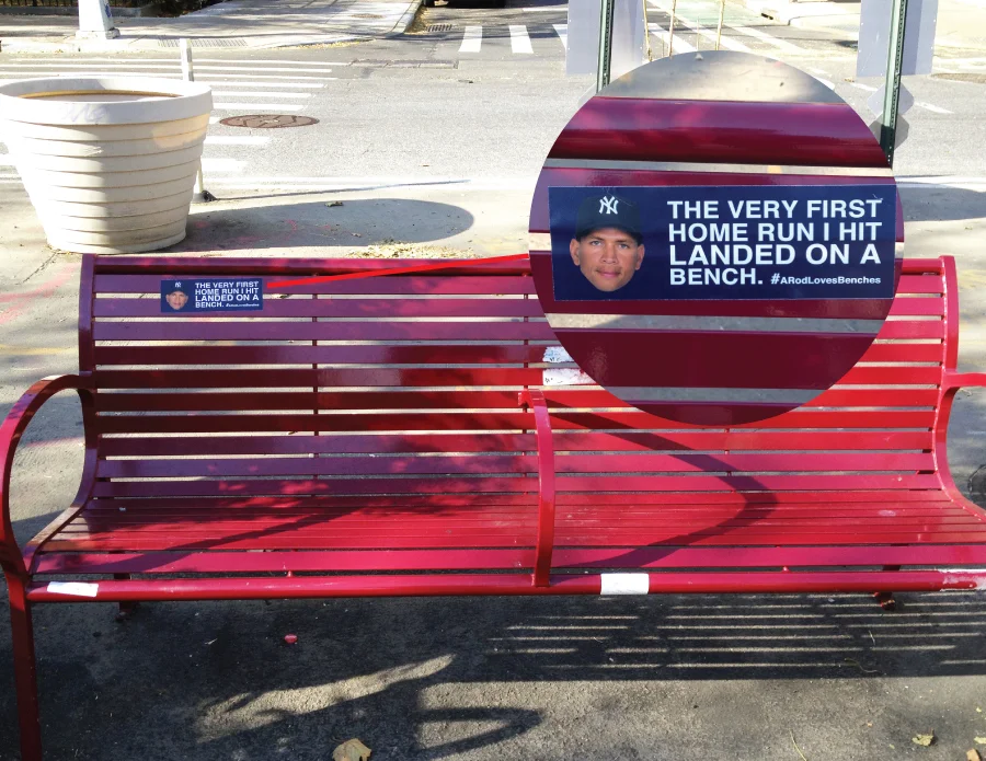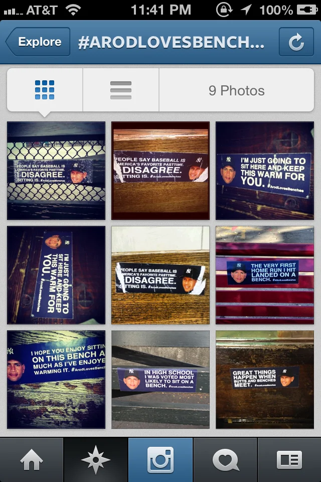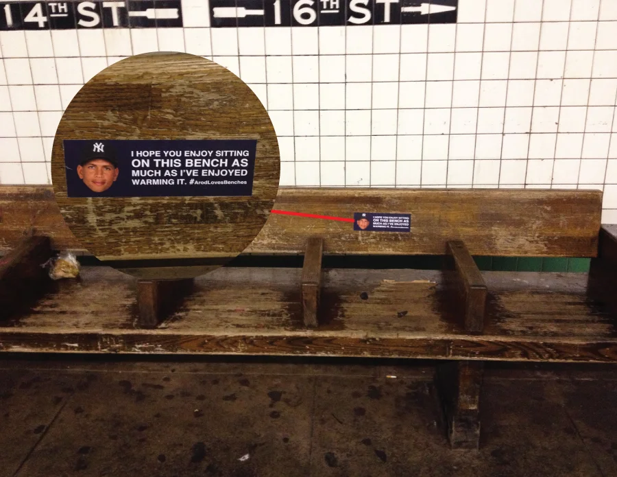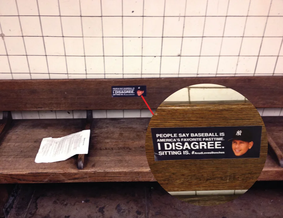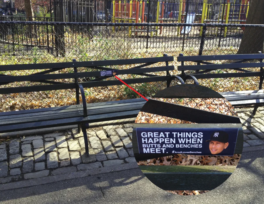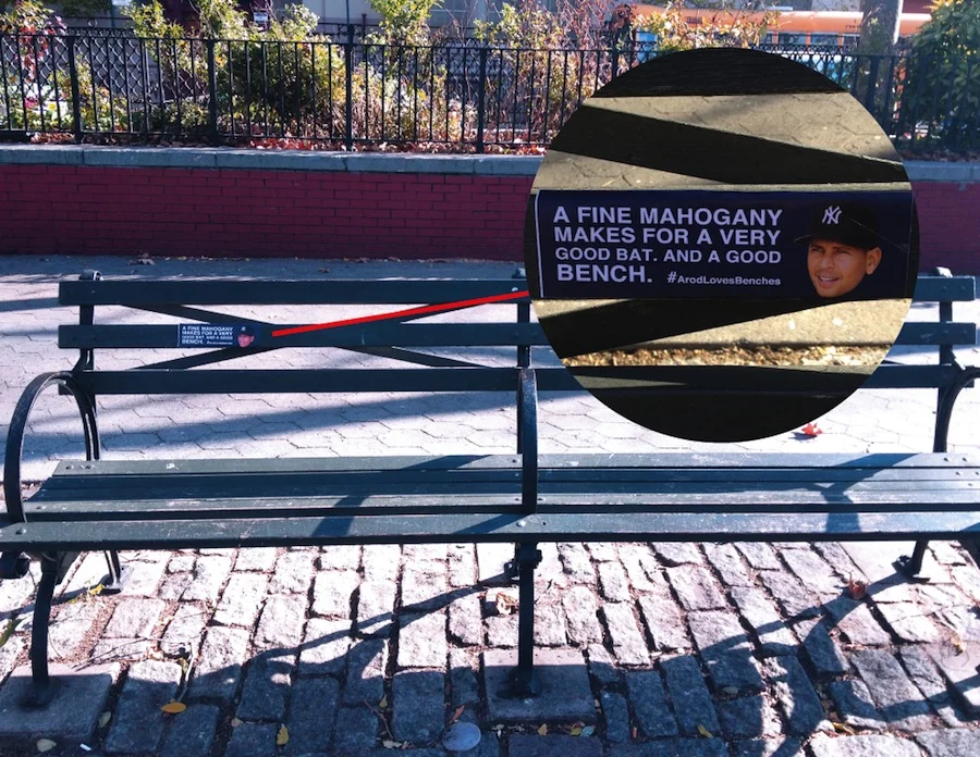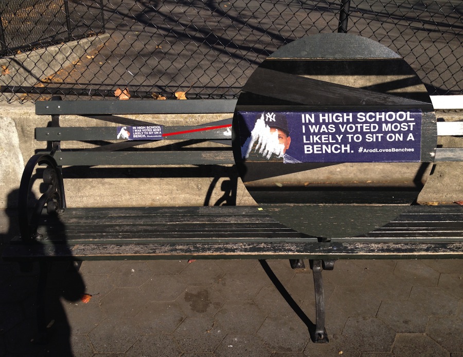 There could only be one explanation for ARod's failures at the plate during the 2012 ALCS: his love for benches. So strong was his love for benches, that he did everything within his power to make sure he was sitting on them. I made stickers that professed his love for sitting and stuck them on benches all around the city of New York. People thought it was hysterical. Unfortunately, hurricane Sandy swooped into the area shortly thereafter with other ideas of its own. :/